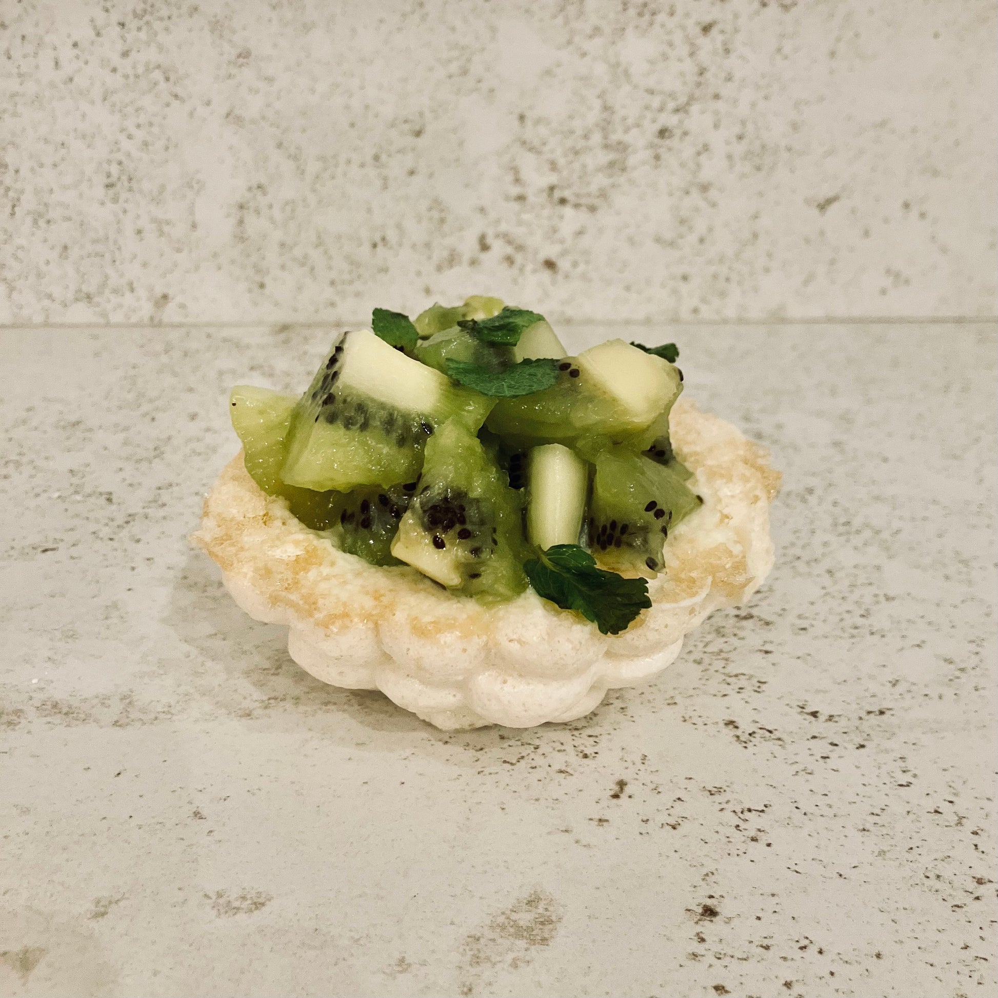Laissez-vous séduire par notre pavlova kiwi-menthe, une création à la fois rafraîchissante et délicate. Sur une base de meringue croquante à l’extérieur et moelleuse à l’intérieur, repose une onctueuse crème fouettée légèrement sucrée. Ce dessert est ensuite généreusement garni de tranches de kiwi frais, apportant une agréable acidité, et parsemé de feuilles de menthe finement ciselées, pour une touche de fraîcheur incomparable. Chaque bouchée allie harmonieusement la douceur, l’acidité et la fraîcheur, pour un dessert qui réveille les papilles avec une explosion de saveurs vivifiantes.